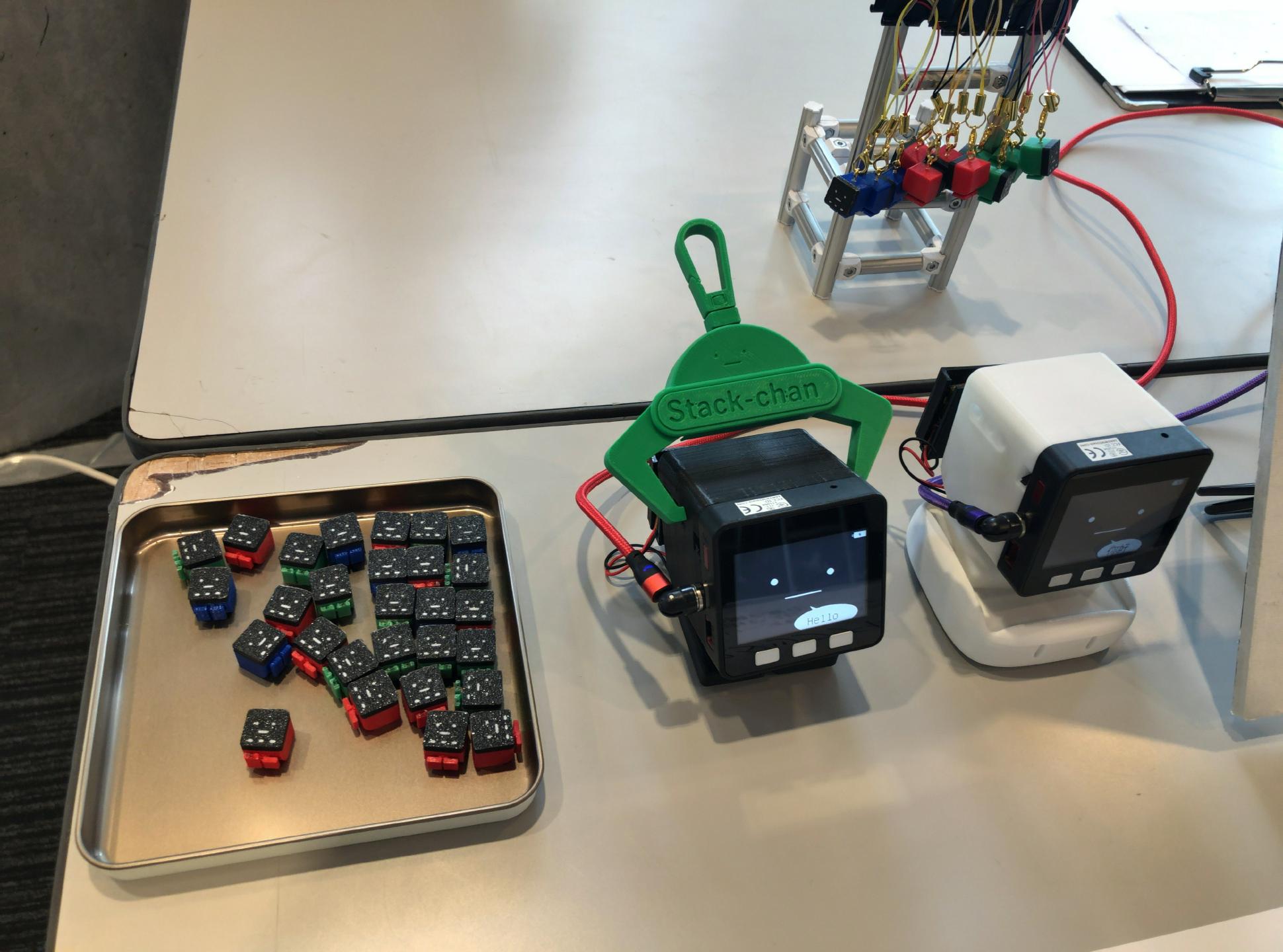 展示コーナーでは、「M5StackとLEDパネル」を用いたものを展示させていただきました。どこがScratchと関係があるのか?というツッコミは無しで。電子工作も可だったので。